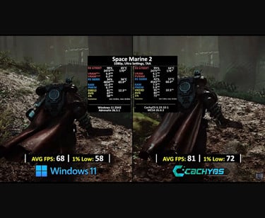Kết quả ban đầu cho thấy Linux có lợi thế rõ rệt trong một số tựa game nặng. Crimson Desert đạt 63 FPS trên CachyOS so với 59 FPS trên Windows 11. Khoảng cách còn lớn hơn trong Warhammer 40,000: Space Marine 2 khi Linux đạt 81 FPS, cao hơn đáng kể so với 68 FPS trên Windows. Đáng chú ý, chỉ số 1% low trên Linux cũng tốt hơn, đồng nghĩa với trải nghiệm mượt mà và ít giật lag hơn.